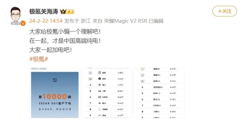 极氪智能科技CMO关海涛发文称,大家给极氪小编一个理解吧!在一起,才是中国高端纯电!大家一起加电吧!